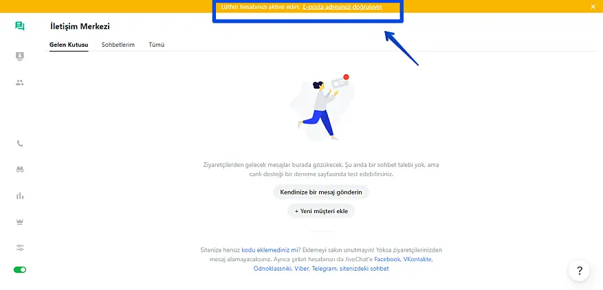 E-posta doğrulanana kadar JivoChat uygulamasının tüm bölümlerinde bu bildirimi göreceksiniz: