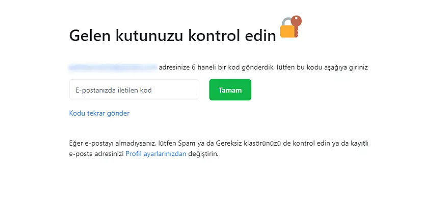E-postanıza gelen kodu girin ve Tamam'a tıklayın.