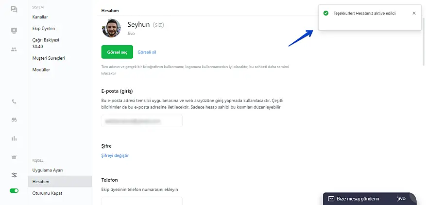 E-postanız şimdi doğrulandı ve JivoChat hesabınızdan tam olarak yararlanabilirsiniz.