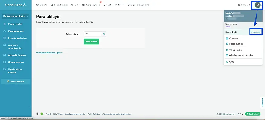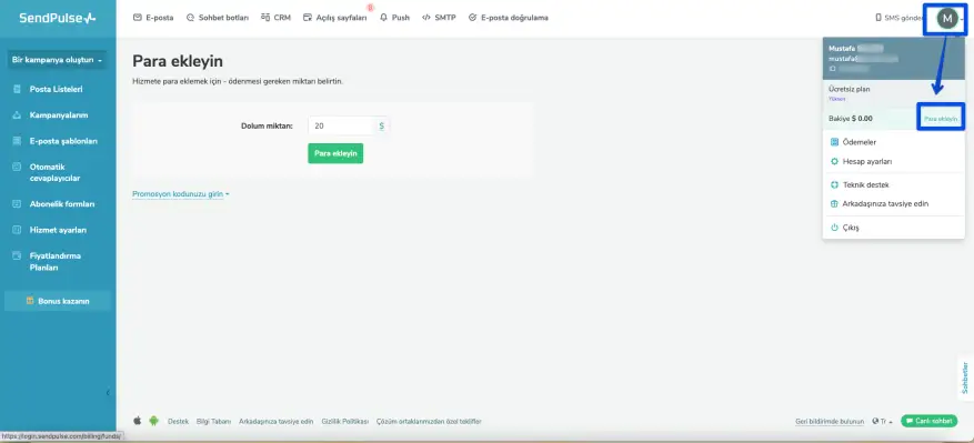 4. SendPulse hesabınızda düzenlemelere başlayın