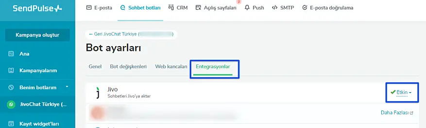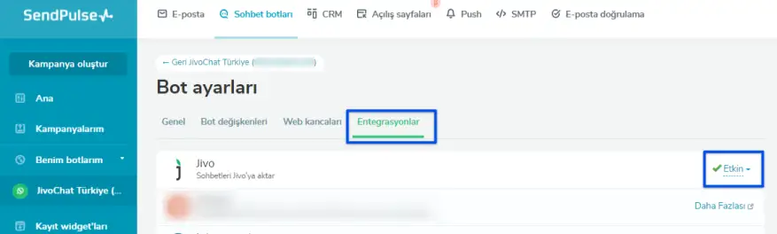 8. SendPulse ile JivoChat'yu birbirine bağlayın