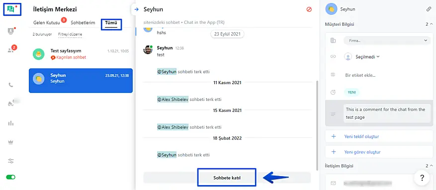 JivoChat uygulamasını açın ve herhangi bir sohbete gidin veya arşivlenmiş olanlardan birini açın (İletişim merkezi > Tümü > "Sohbeti Başlat" düğmesi):