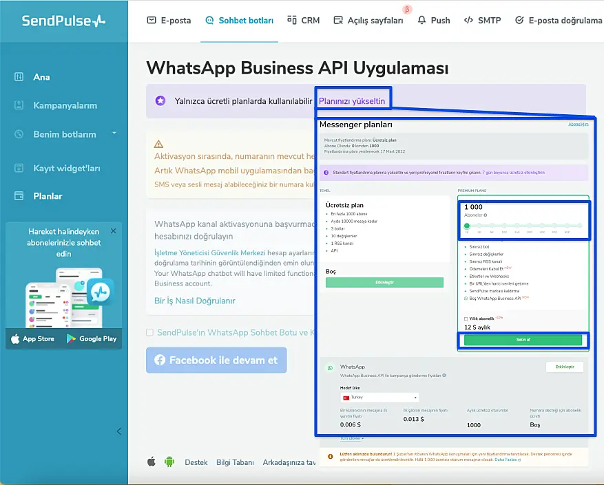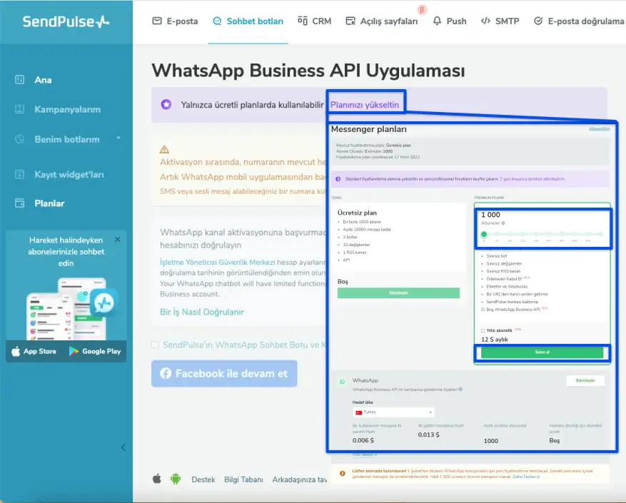 Henüz bir plan seçmediyseniz, "Planınızı yükseltin"e tıklayın ve gerekli abone sayısına sahip bir paket seçin (minimum 1000 abone). Satın Al'ı tıklayın.