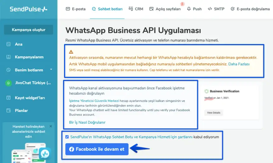 Bot modu, doğrulanmış bir Facebook işletme hesabınızın olup olmamasına bağlı olacaktır. Hesap doğrulanmadıysa, deneme erişiminde sohbet botunu kullanabileceksiniz.