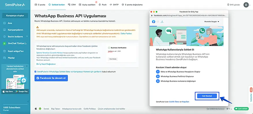 Ardından, hesap kurulum sihirbazı bir WhatsApp sohbet botu oluşturmaya başlayacaktır. "Başlayın" ı tıklayın.