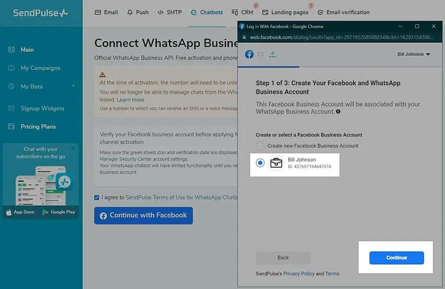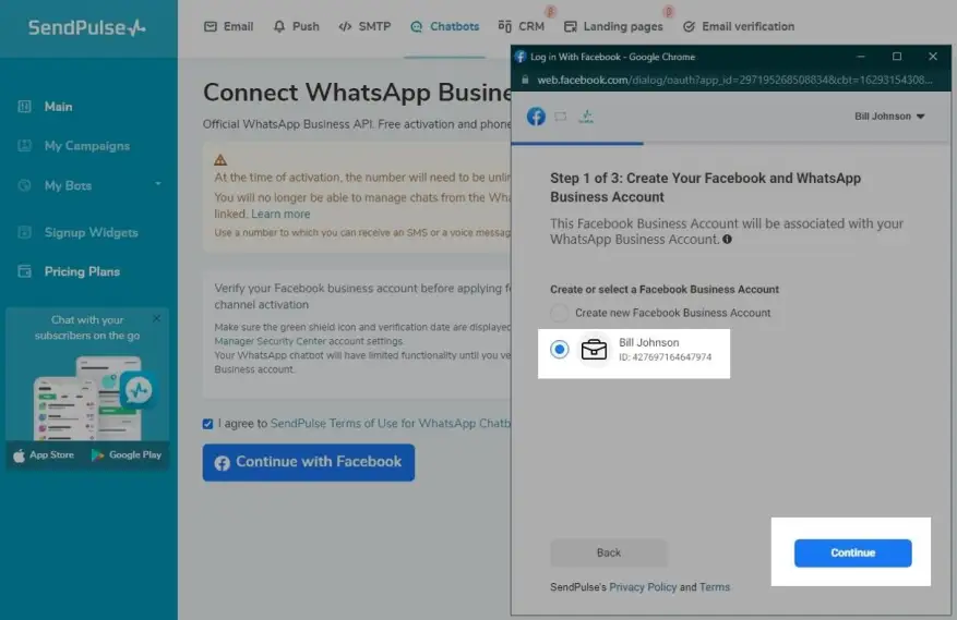 Doğru verileri girerseniz, hesabınız başarıyla etkinleştirilecektir. SendPulse hesabında, kanalı etkinleştirmek için "Devam"a tıklayın.