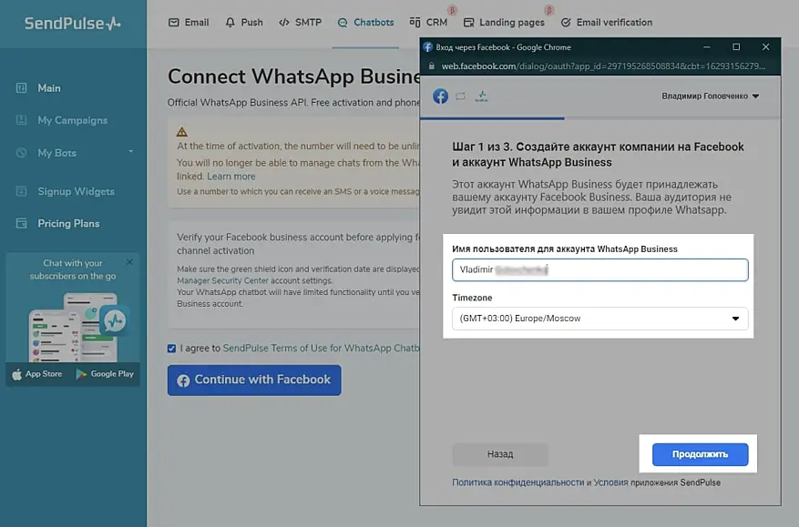 Ardından, seçilen Facebook işletme hesabı için bir WhatsApp Business hesabı oluşturmak üzere bir kullanıcı adı ve saat dilimi sağlayın.