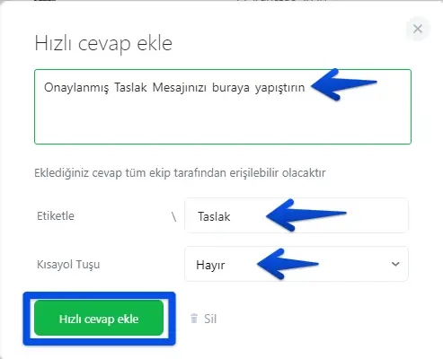 Onaylanmış Taslak Mesajınızı(Template Message), SendPulse panelinizde olduğu şekliyle yapıştırın, daha sonra sohbette göndermek üzere istediğiniz Taslak Mesajı hızlıca bulup seçmek için kullanabileceğiniz bir / etiketi seçin, klavyenizde hızlı bir kısayol seçin ( İsteğe bağlı) ve Hızlı cevap ekle seçeneğine tıklayın.