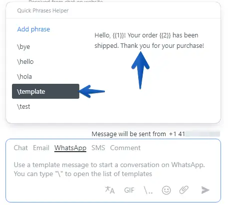 Bir ziyaretçi / müşteri ile görüşme sırasında, konuşma penceresinde WhatsApp için bir giriş seçeneği göreceksiniz. Onu seçin ve kullanmak istediğiniz onaylanmış Taslak Mesajını içeren hangi WhatsApp numarasından gönderileceğini seçin.